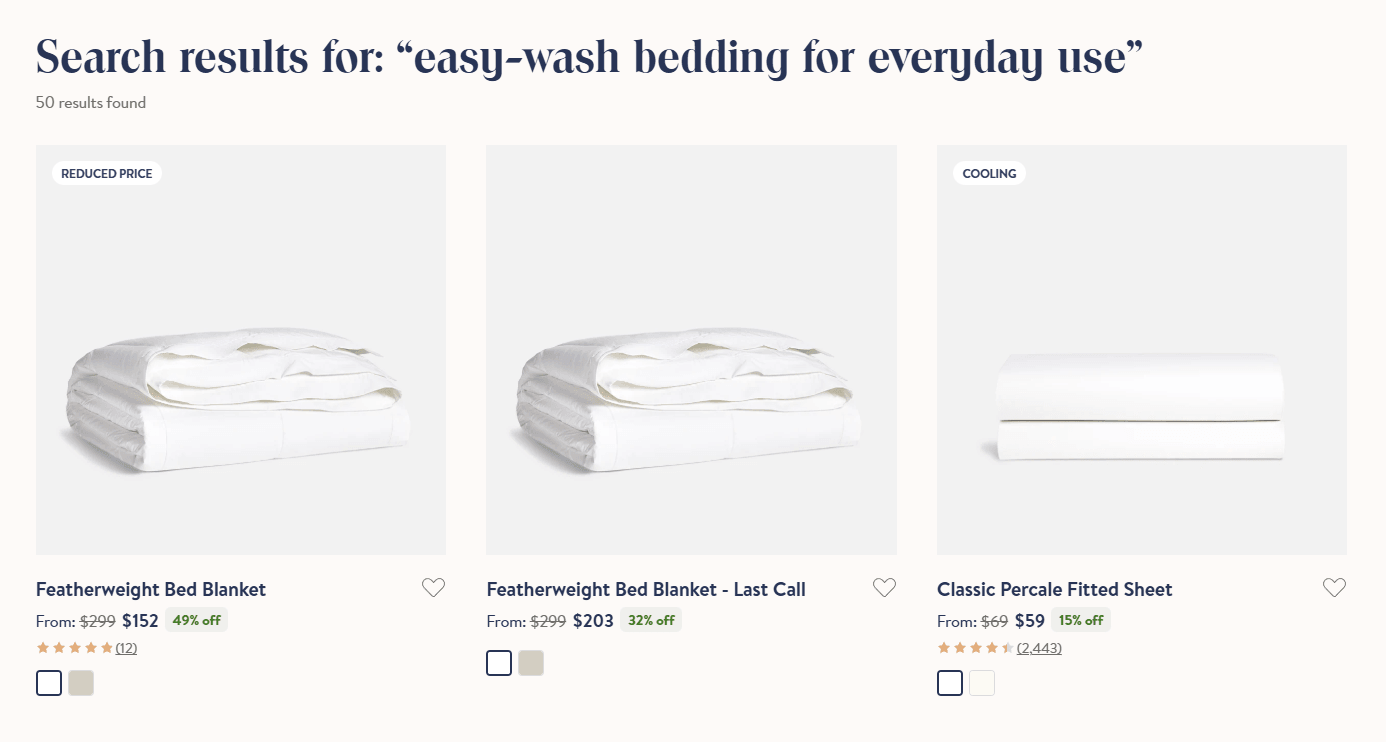 Natural language searches. Customers don’t have to guess a product title or use specific keywords to find what they’re after.
